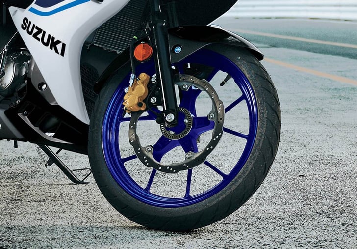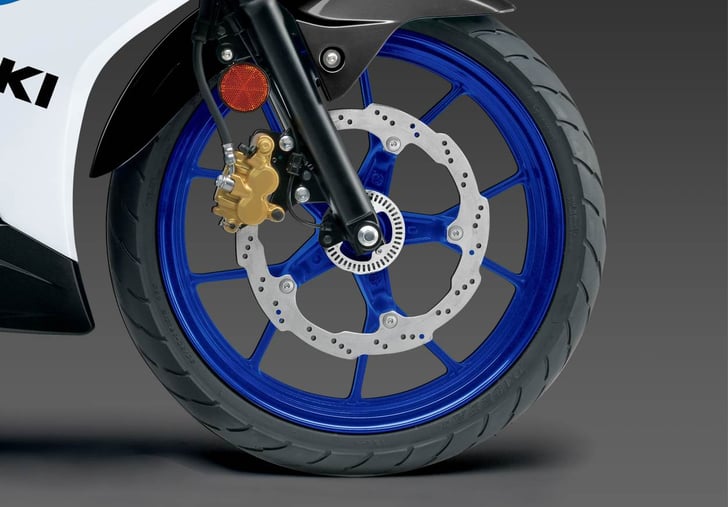 Contributing to the bikes low weight are the 10 spoke cast aluminium wheels. Having light weight wheels helps ensure great handling, for a ride that’s fun and a machine that goes exactly where you want it to. The slim design of the spokes also adds to this GSX-R’s great sportsbike looks, along with the sporty petal type brake discs front and rear.